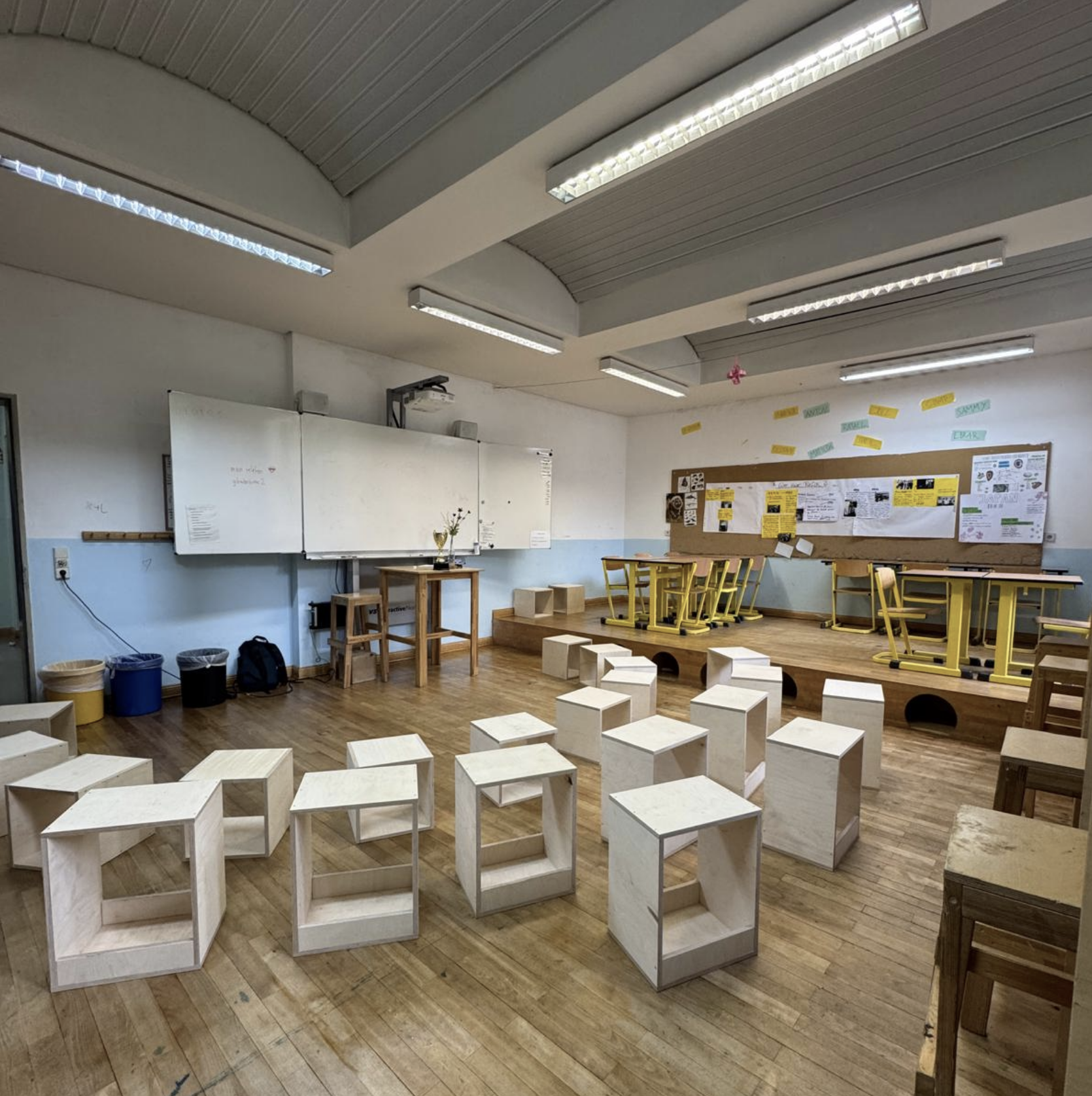 Ein besonderes Highlight: Gemeinsam mit unserem Tischler Tom und den Lehrkräften haben die Schülerinnen und Schüler die neuen „Monte-Hocker“ selbst gebaut. Entstanden sind dabei rund 45 große und 30 kleine Hocker.